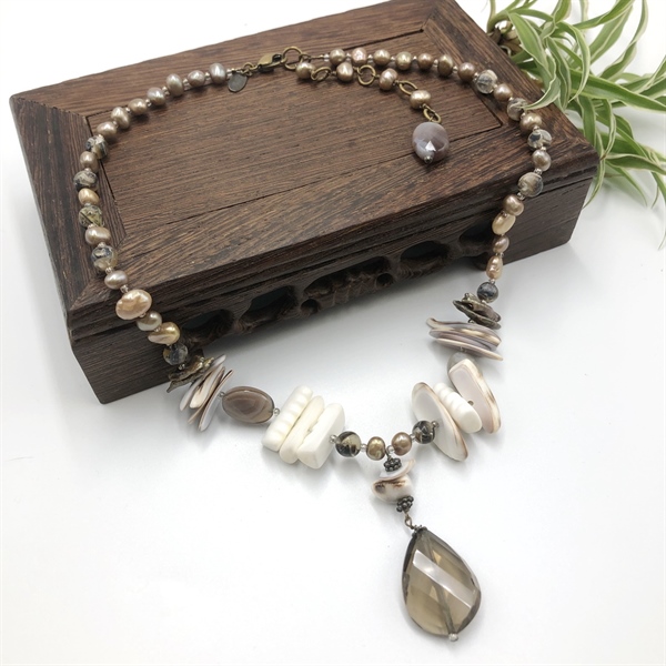 Vòng cổ ngọc trai, mặt vỏ ốc mix ngọc trai và pha lê