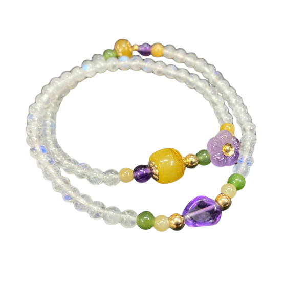 Vòng tay đá moonstone thiên nhiên 4mm quấn 3 vòng tay mix thạch anh tím, hổ phách - Cái